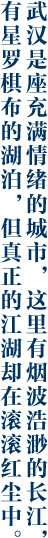 我忆起在武汉的每一餐,氤氲的气氛,人们的谈资,碗筷刀叉的交响,平静的湖水,汹涌的芦苇荡,比起具体白纸黑字间落下来的菜单与食谱,更多的是这些情景。寄予唇齿舌尖以情愫,浓郁,是如此的复杂,又有一种淡淡的不知从何而起的神伤。